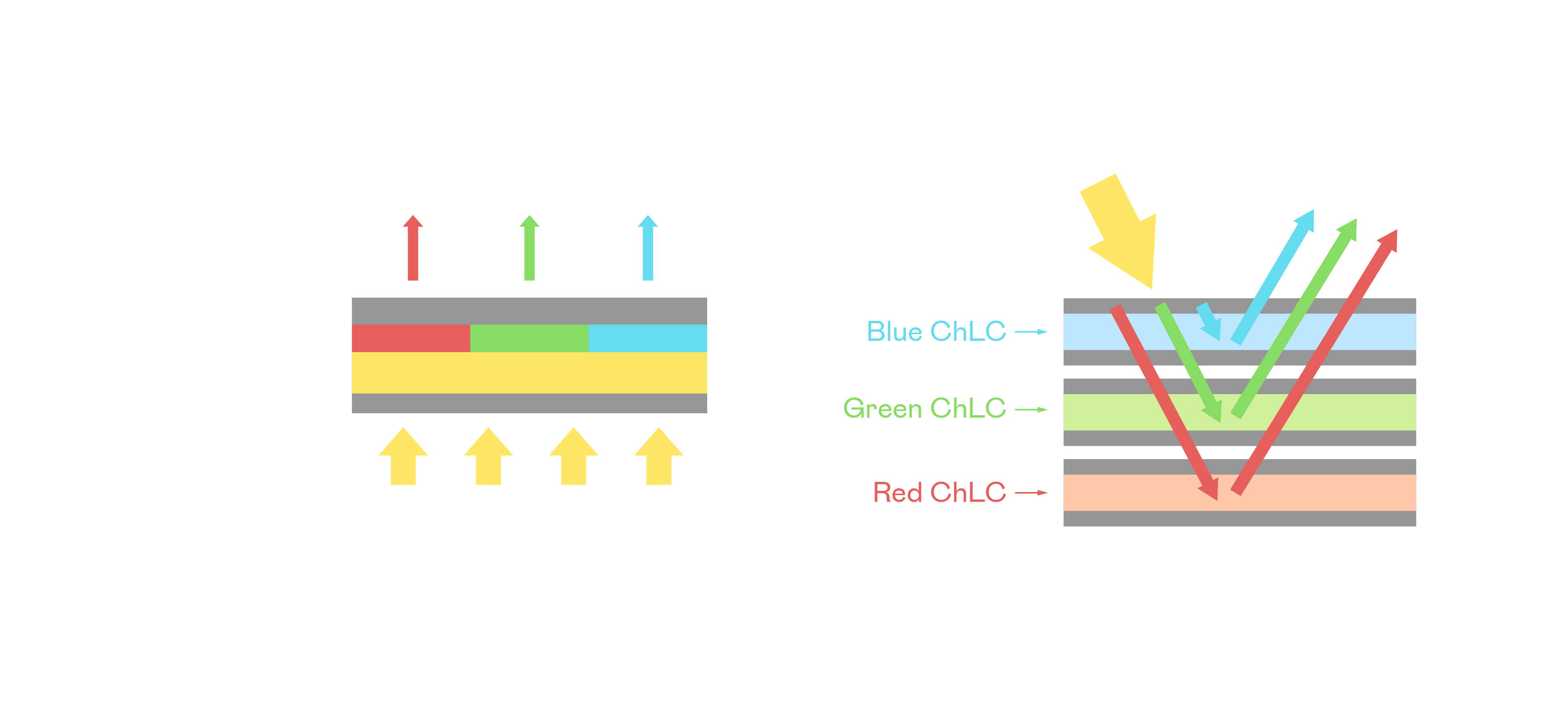 PA视讯胆固醇液晶显示器是由红、绿、蓝三层胆固醇液晶面板堆叠而成,并采用无彩色滤光片设计,减少环境光在反射过程中的损耗。